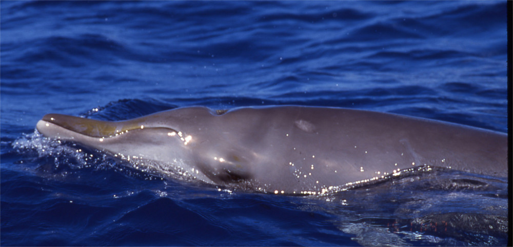 Blainville’s beaked whales are smaller than Cuvier’s, but have similar diving and hunting behaviors. The “beak” refers to the rostrum or snout of the whale which is elongated rather than blunt-headed. Individual identification, once considered impossible, is facilitated by the light oval scars from the bites of cookie-cutter sharks.
